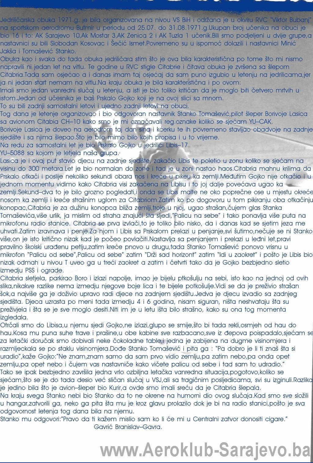 Citabrija sletjela, parkirao Boro i izlazi napolje, imao je bijelu potkošulju na sebi, isto kao na jednoj od ovih slika, nikakve razlike nema između njegove boje lica i te bijele potkošulje. Vidi se da je preživio strašan šok, a najviše ga je doživio upravo radi djece na zadnjem sjedištu. Jedva je djecu izvadio sa zadnjeg sjedišta. Djeca uzrasta, po meni, tada izmedju 4 i 6 godina, nisam siguran, ništa ne shvataju šta su preživjela i šta se je sve moglo desiti. Niti im je u letu išta bilo strašno, kako su ona tog momenta izgledala. Otrčali smo do Libisa, u njemu sjedi Gojko, ne izlazi, glupo se smije, što bi tada rekli, osmjeh od hau do hau. Kosa mu puna suhe trave i prašine, u obje kabine sve razbacano, sve iz džepova poispadalo, sjećam se za letački doručak smo dobivali neke čokoladne table, i jedna je zabijena na dugme visinomjera i razmljeckala se po staklu visinomjera. Dođe Stanko Tomašević i pita ga: “Pa dobro, je li ti znaš šta si uradio”, kaže Gojko: ”Ne znam, znam samo da sam prvo vidio zemlju, pa zatim nebo, pa onda opet zemlju, pa opet nebo i čujem vas nastavniče kako vičete palicu od sebe i tad sam to udradio.”